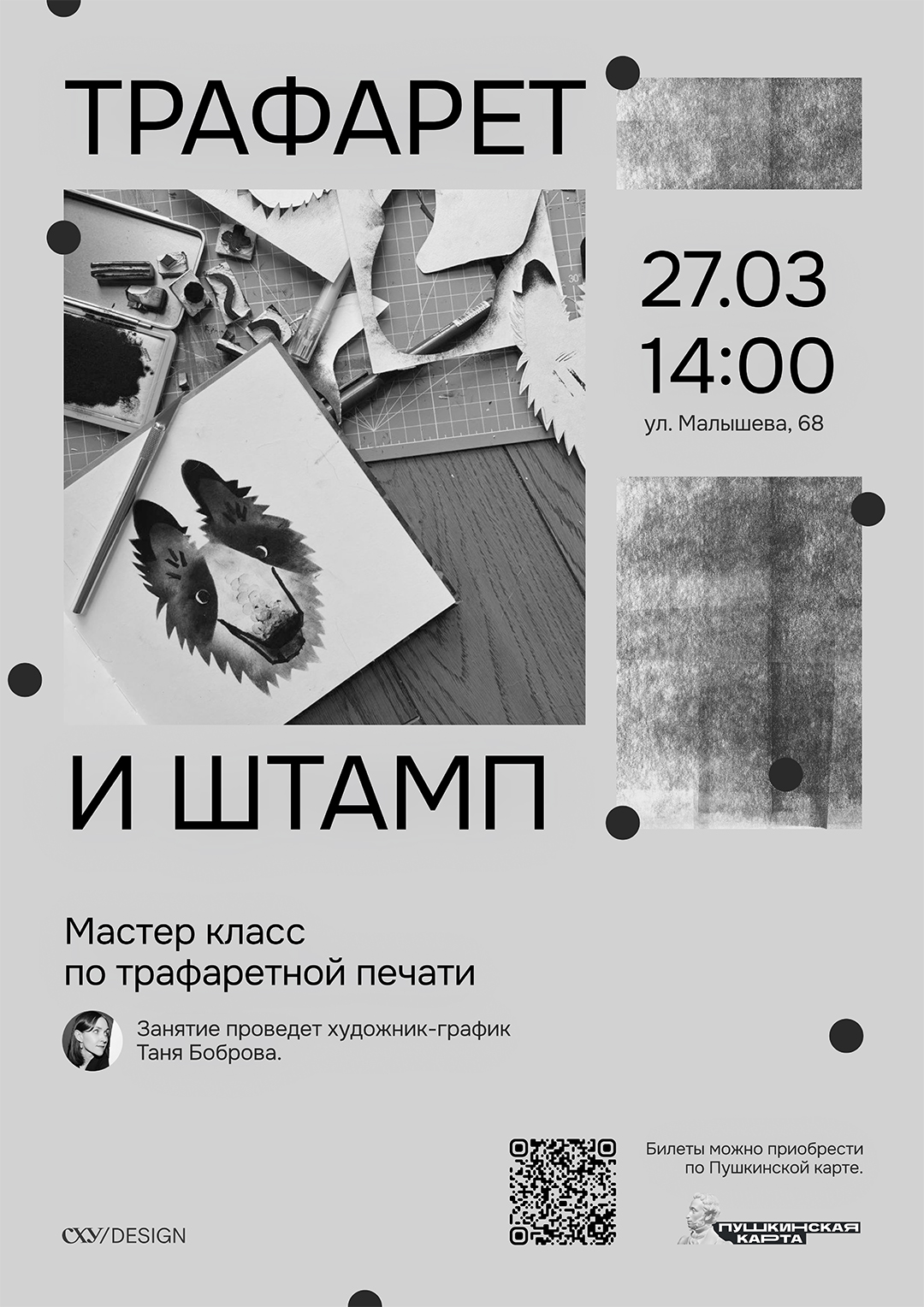 Билеты можно приобрести по Пушкинской и банковской карте по QR-коду или указанной ссылке: https://vmuzey.com/event/master-klass-trafaret-i-shtamp